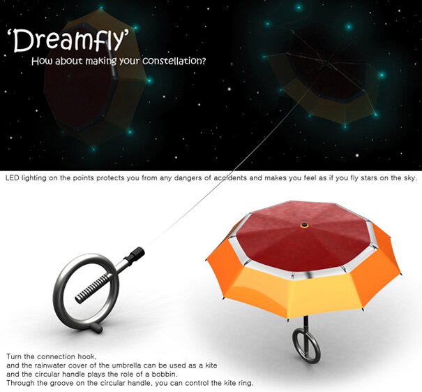 This one here, the Dreamfly is for the sheer joy of a carefree childhood. It’s not an earth-shattering idea, and its existence will not make any difference in your efficiency. But it will bring you a few moments of laughter, and maybe some bonding time with loved ones. The concept is of an umbrella that flies (like a kite)…Mary Poppins beware! It’s got jazzy LED lights that glimmer at night and basically implores you to drag yourself outdoors to catch some wind and fun!