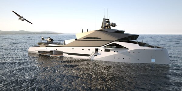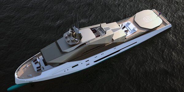 The Dune 90 strays from the common “wedding cake” stacking style of the current yacht market and instead boasts monolithic approach inspired by stealth frigates and rippling sand dunes. The result is a crisp, lean, and classy look that still maintains the modern luxuries you’d expect from a yacht of this size; including 10 guest cabins, swimming pool, berths for a submarine or wave-runners, and like any good megayacht- a helipad.