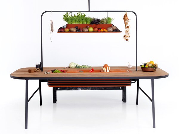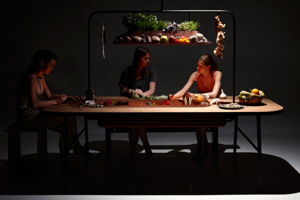 - The larder consists of an evaporative cooler and vegetable storage system built into a dining table.