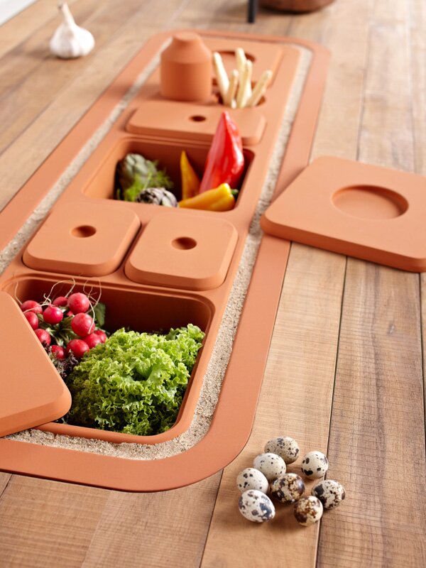 - Above the table is a ceramic garden and larder where vegetable groups are grown and stored on the basis of their symbiotic chemistry.