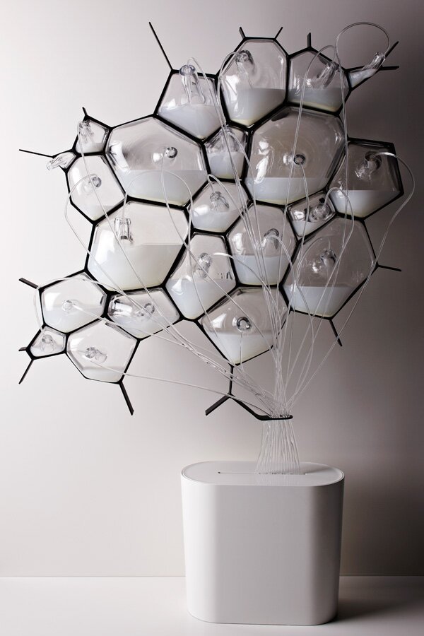 - Each cell is connected via silicon tubes to the food source, (which is drawn from a reservoir at the base) creating a closed loop system for the living material.